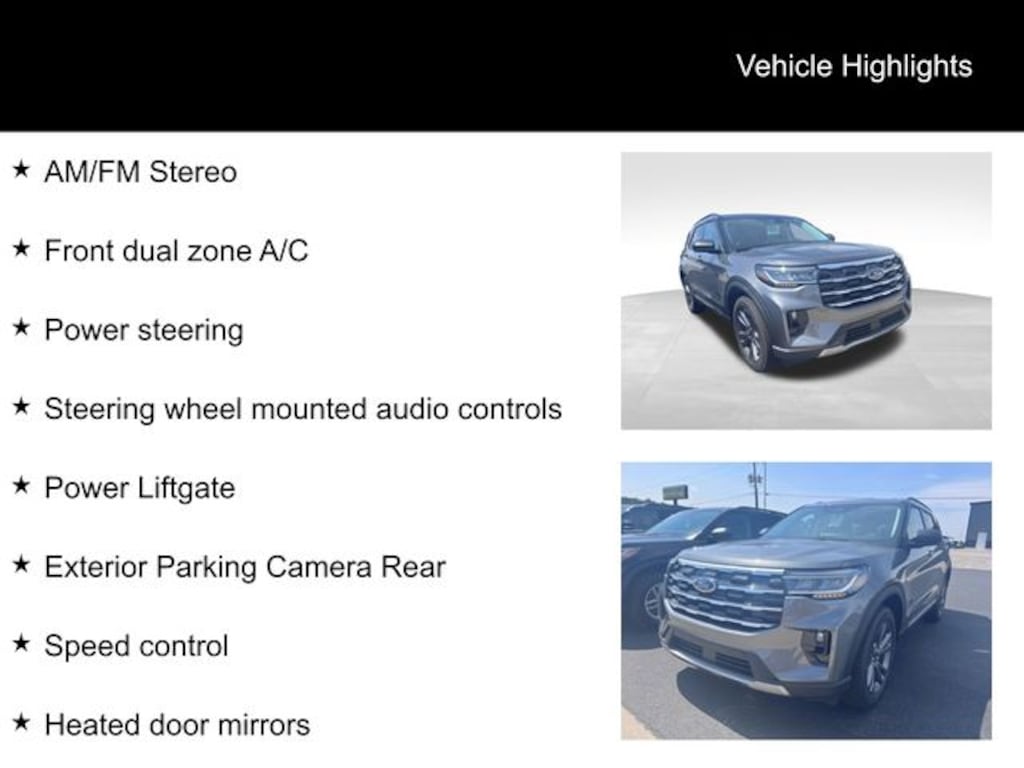 Carbonized Gray Metallic 2025 Ford Explorer Active 4WD 10-Speed Automatic 2.3L EcoBoost I-4 3rd row seats: bench, AM/FM Stereo, Apple CarPlay/Android Auto, Exterior Parking Camera Rear, Front dual zone A/C, Heated door mirrors, Heated front seats, Power Liftgate, Power steering, Speed control, Steering wheel mounted audio controls.