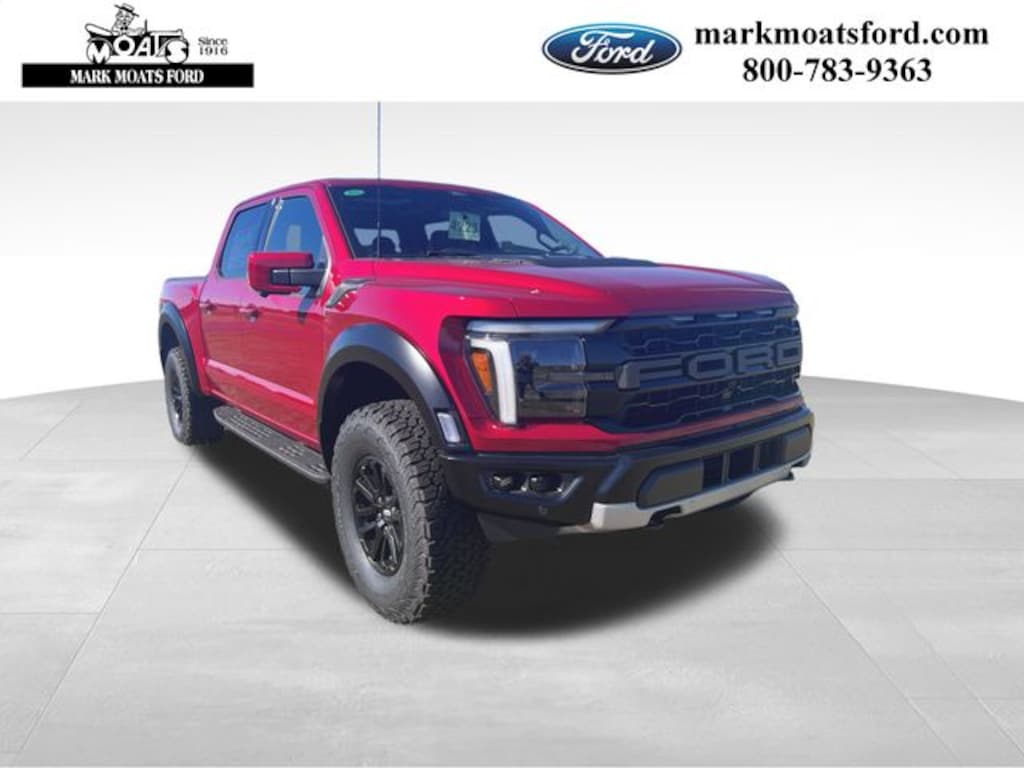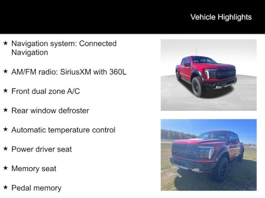 Rapid Red Metallic Tinted Clearcoat 2025 Ford F-150 Raptor 4WD 10-Speed Automatic 3.5L V6 EcoBoost AM/FM radio: SiriusXM with 360L, Automatic temperature control, Brake assist, Front dual zone A/C, Heads-Up Display, Heated front seats, Heated rear seats, Heated steering wheel, Memory seat, Navigation system: Connected Navigation, Pedal memory, Power driver seat, Rear window defroster, Speed control, Speed-sensing steering, Steering wheel memory, SYNC 4 w/Enhanced Voice Recognition, Twin Panel Moonroof, Ventilated front seats.
