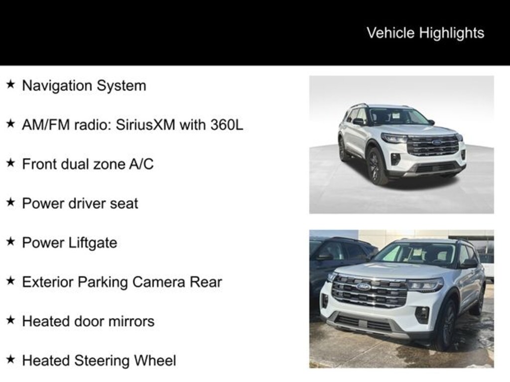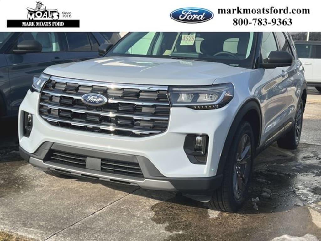 Space White Metallic 2026 Ford Explorer Active 4WD 10-Speed Automatic 2.3L EcoBoost I-4 3rd row seats: bench, AM/FM radio: SiriusXM with 360L, Apple CarPlay/Android Auto, Exterior Parking Camera Rear, Front dual zone A/C, Heated ActiveX Seating Material Captain's Chairs, Heated door mirrors, Heated Steering Wheel, Navigation System, Power driver seat, Power Liftgate.