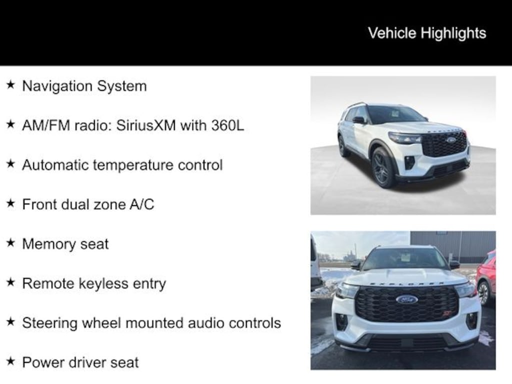 Star White Metallic Tri-Coat 2026 Ford Explorer ST 4WD 10-Speed Automatic 3.0L EcoBoost V6 3rd row seats: bench, AM/FM radio: SiriusXM with 360L, Apple CarPlay/Android Auto, Automatic temperature control, Exterior Parking Camera Rear, Front dual zone A/C, Heated door mirrors, Heated rear seats, Heated steering wheel, Heated/Ventilated Miko Captain's Chairs, Memory seat, Navigation System, Panoramic Fixed Glass Roof with Power Shade, Power driver seat, Power Liftgate, Remote keyless entry, Speed control, Steering wheel mounted audio controls.