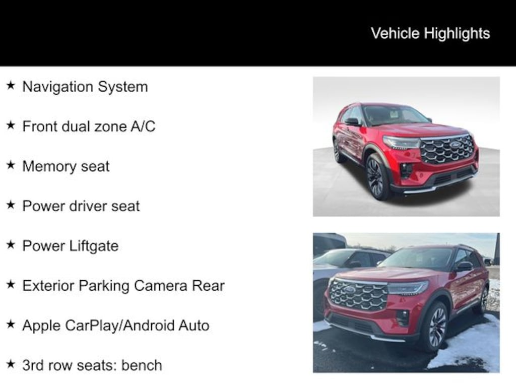 Rapid Red Metallic Tinted Clearcoat 2026 Ford Explorer Platinum 4WD 10-Speed Automatic 2.3L EcoBoost I-4 3rd row seats: bench, Apple CarPlay/Android Auto, Exterior Parking Camera Rear, Front dual zone A/C, Memory seat, Navigation System, Power driver seat, Power Liftgate.