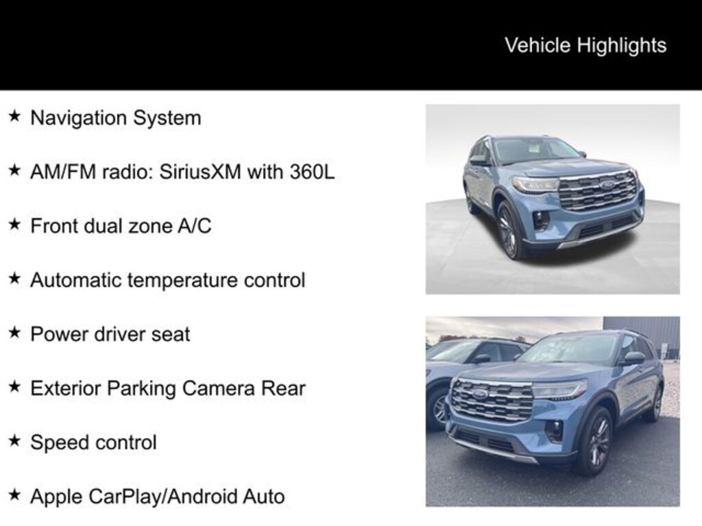 Vapor Blue Metallic 2026 Ford Explorer Active 4WD 10-Speed Automatic 2.3L EcoBoost I-4 3rd row seats: bench, AM/FM radio: SiriusXM with 360L, Apple CarPlay/Android Auto, Automatic temperature control, Exterior Parking Camera Rear, Front dual zone A/C, Navigation System, Power driver seat, Speed control.