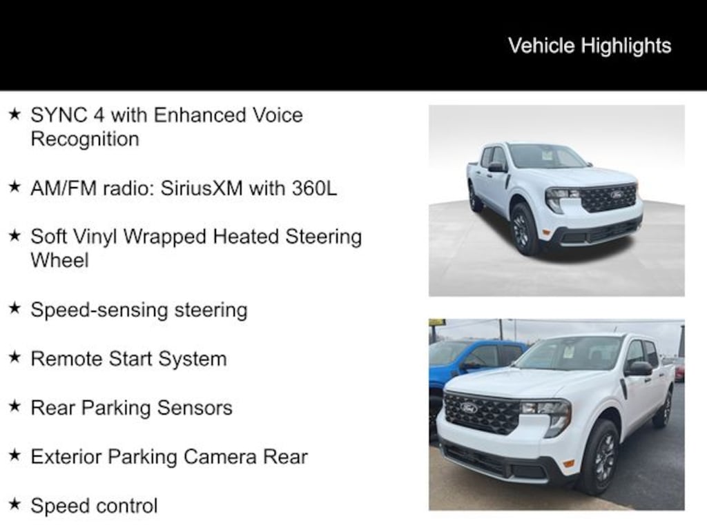 Oxford White 2026 Ford Maverick XLT AWD 8-Speed Automatic EcoBoost 2.0L I4 GTDi DOHC Turbocharged VCT AM/FM radio: SiriusXM with 360L, Apple CarPlay/Android Auto, Exterior Parking Camera Rear, Heated Seats, Rear Parking Sensors, Remote Start System, Soft Vinyl Wrapped Heated Steering Wheel, Speed control, Speed-sensing steering, SYNC 4 with Enhanced Voice Recognition.