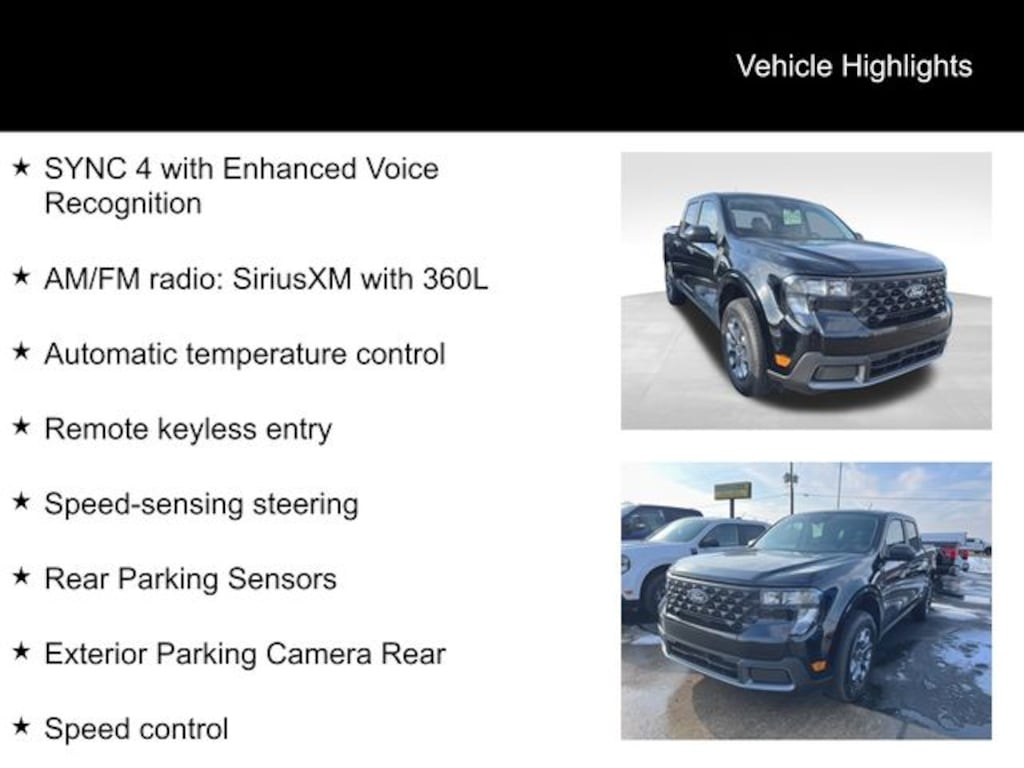 Shadow Black 2026 Ford Maverick XLT FWD CVT 2.5L I-4 Hybrid AM/FM radio: SiriusXM with 360L, Apple CarPlay/Android Auto, Automatic temperature control, Exterior Parking Camera Rear, Rear Parking Sensors, Remote keyless entry, Speed control, Speed-sensing steering, SYNC 4 with Enhanced Voice Recognition.