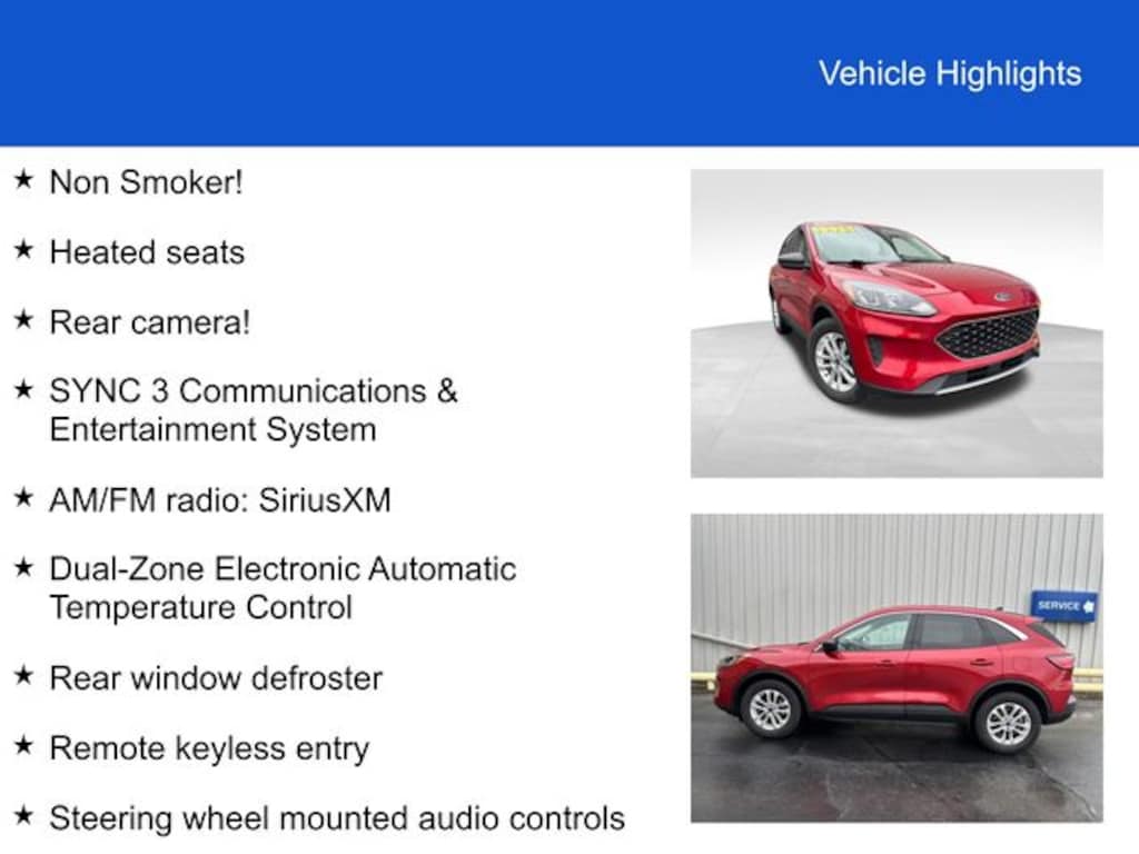 Rapid Red Metallic Tinted Clearcoat 2022 Ford Escape SE AWD 8-Speed Automatic 1.5L EcoBoost Non Smoker! Heated seats, Rear camera! 8-Way Power Driver Seat, AM/FM radio: SiriusXM, Dual-Zone Electronic Automatic Temperature Control, Fold-Down Rear Center Armrest w/2 Cupholders, Heated & Premium Wrapped Steering Wheel, Heated Sideview Mirrors, Power Liftgate, Power steering, Rear window defroster, Remote keyless entry, Speed control, Steering wheel mounted audio controls, SYNC 3 Communications & Entertainment System.